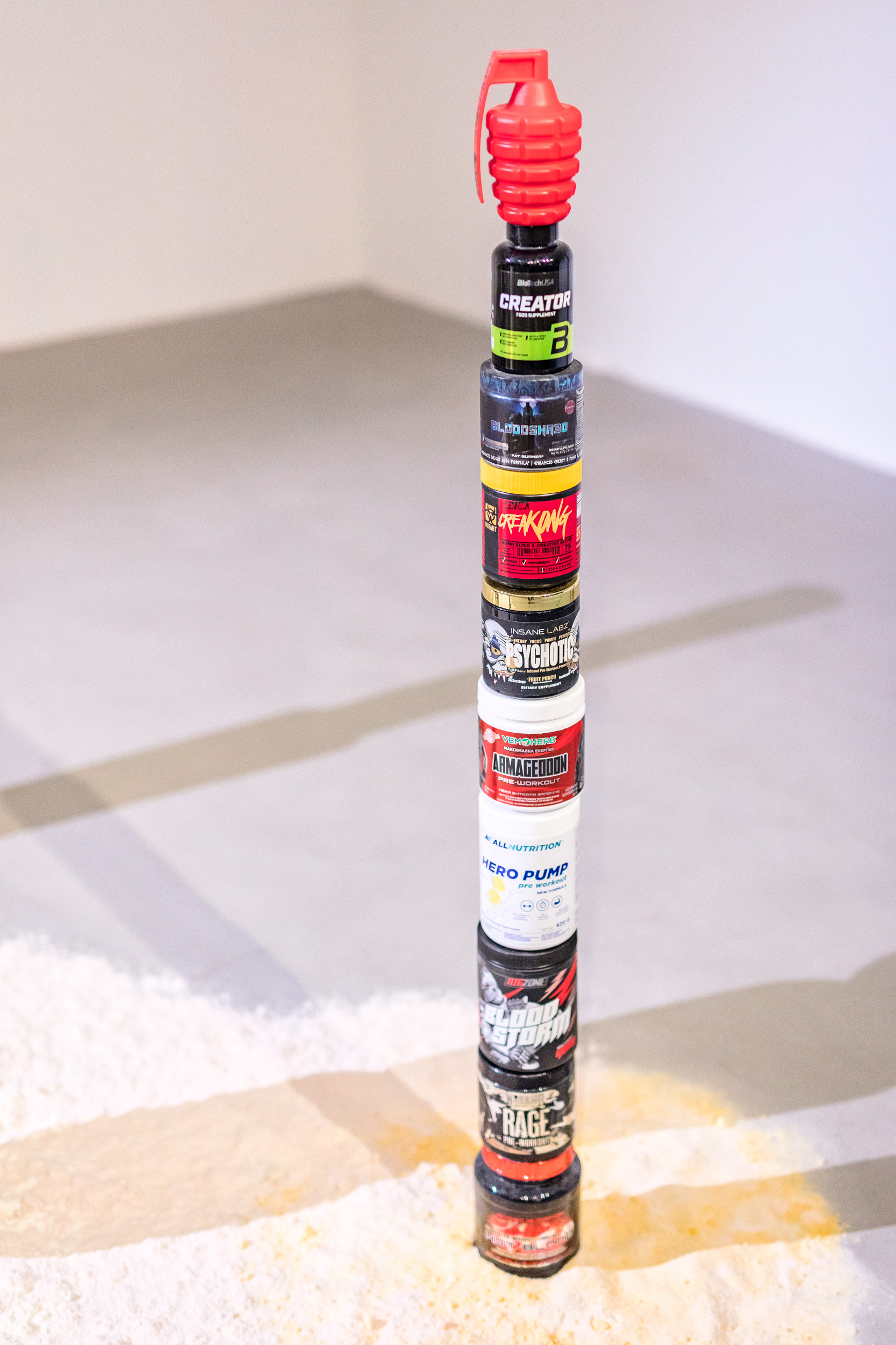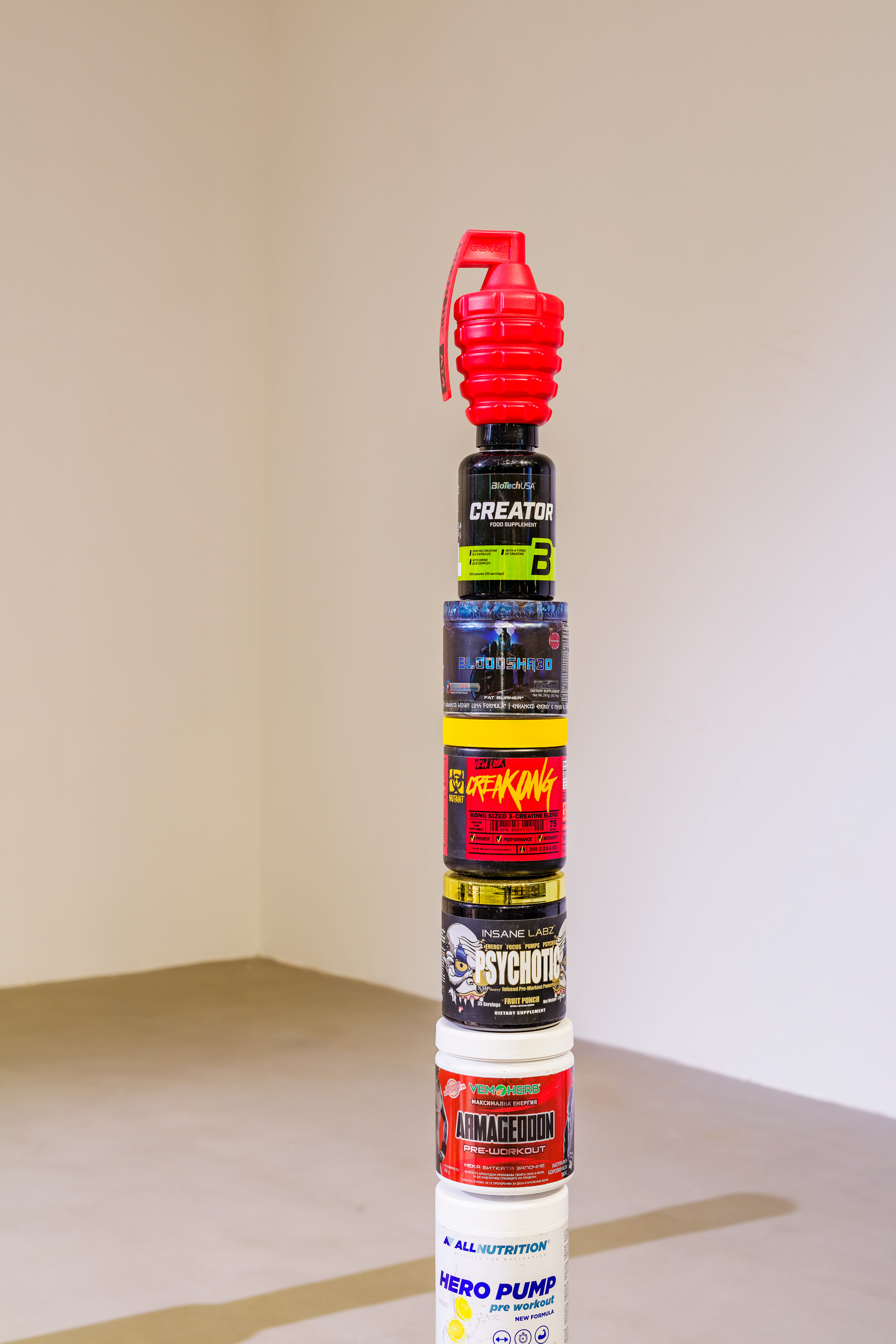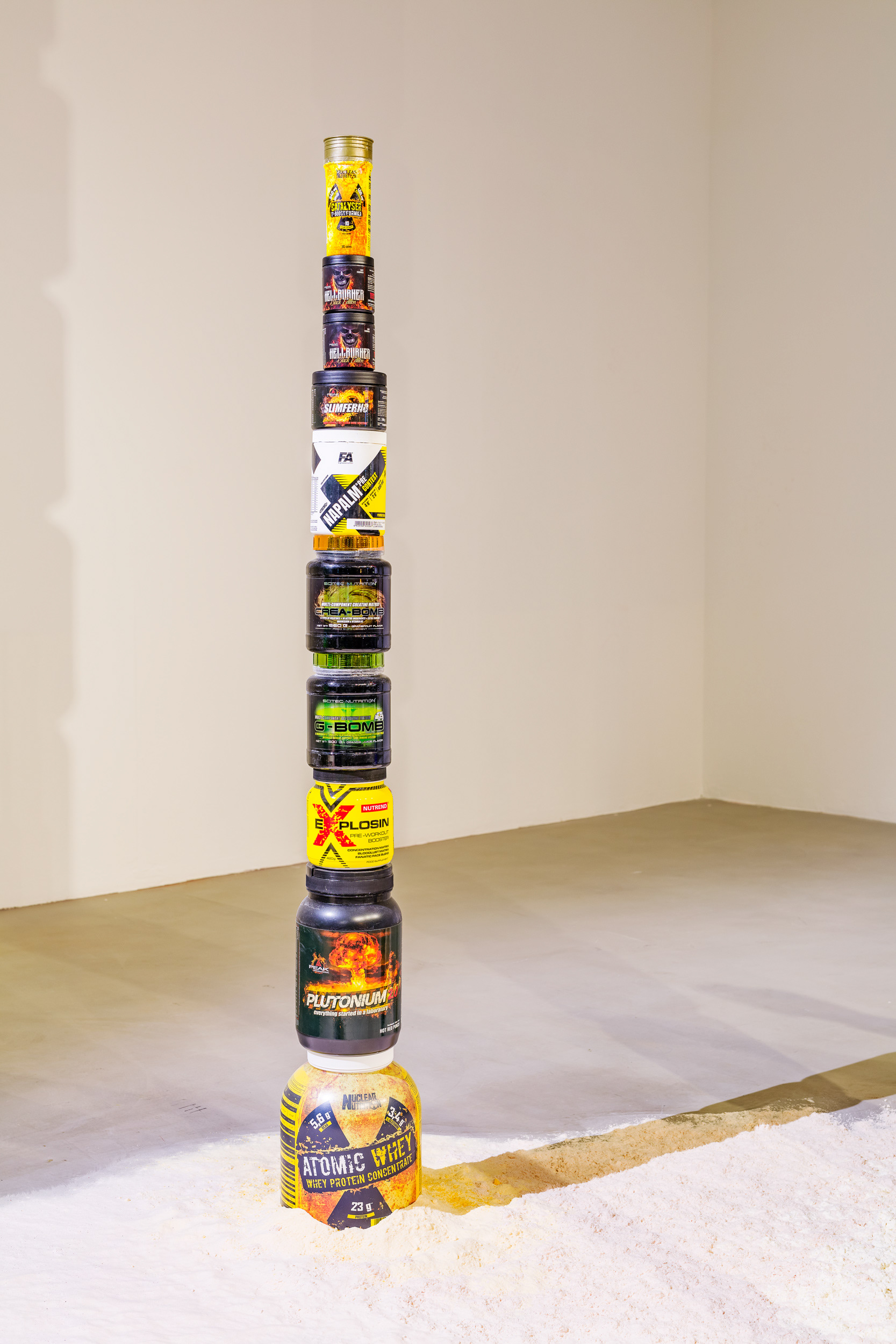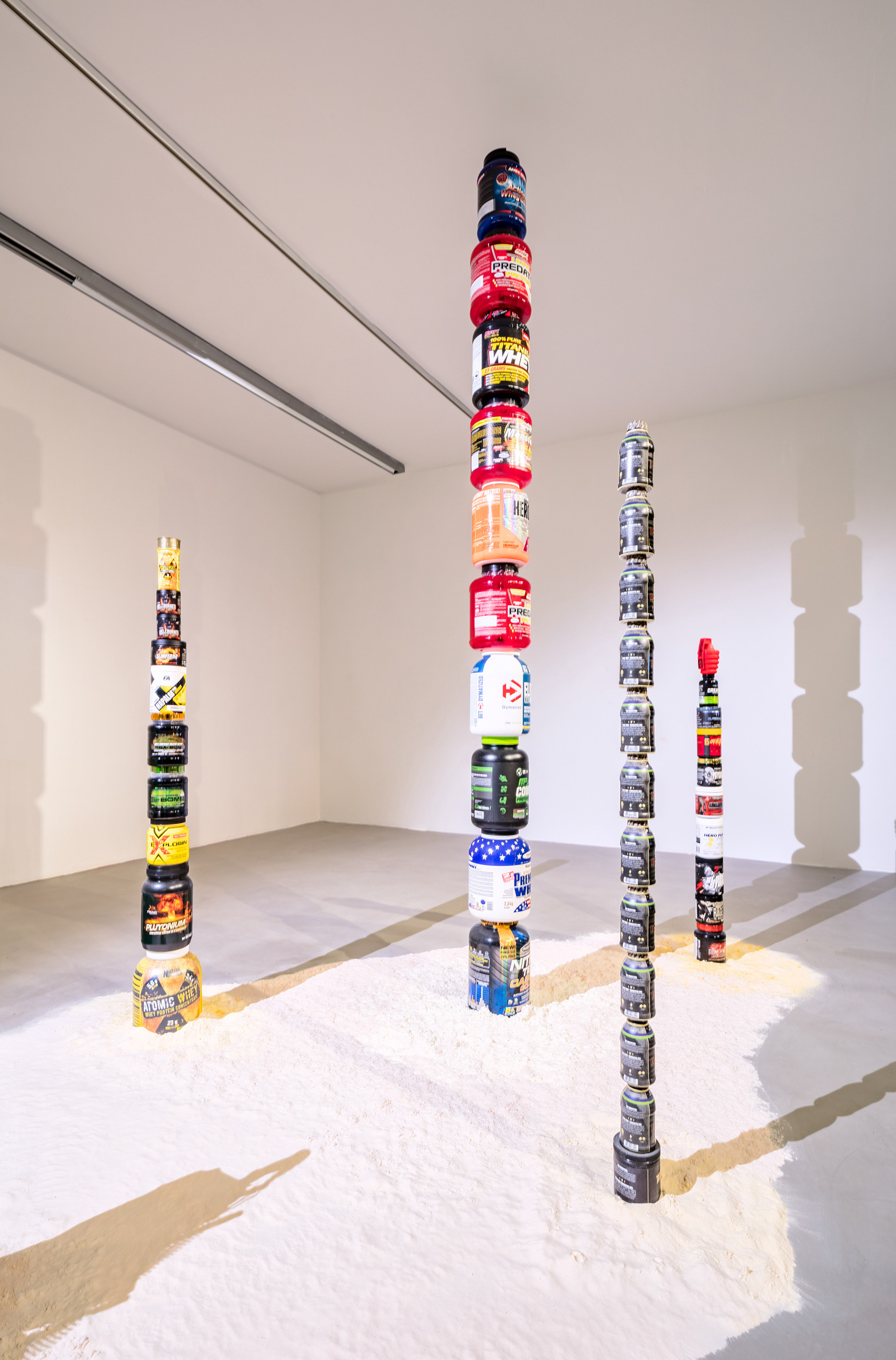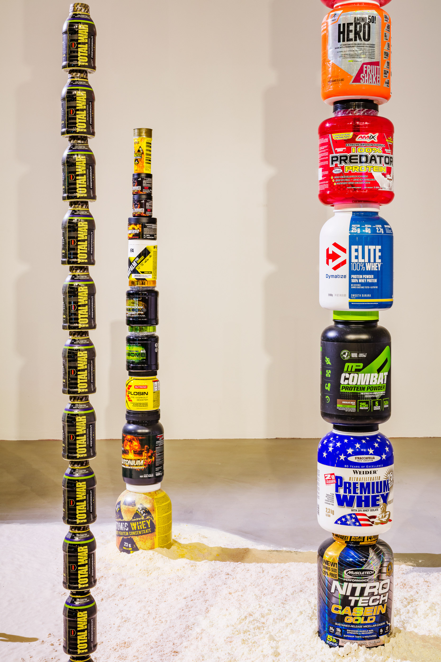 Pillars of heroes, 2020, protein and fitness stimulant containers and protein powder, variable dimensions (Building a real body exhibition, KHB Bratislava, foto: Jakub Hauskrecht)
