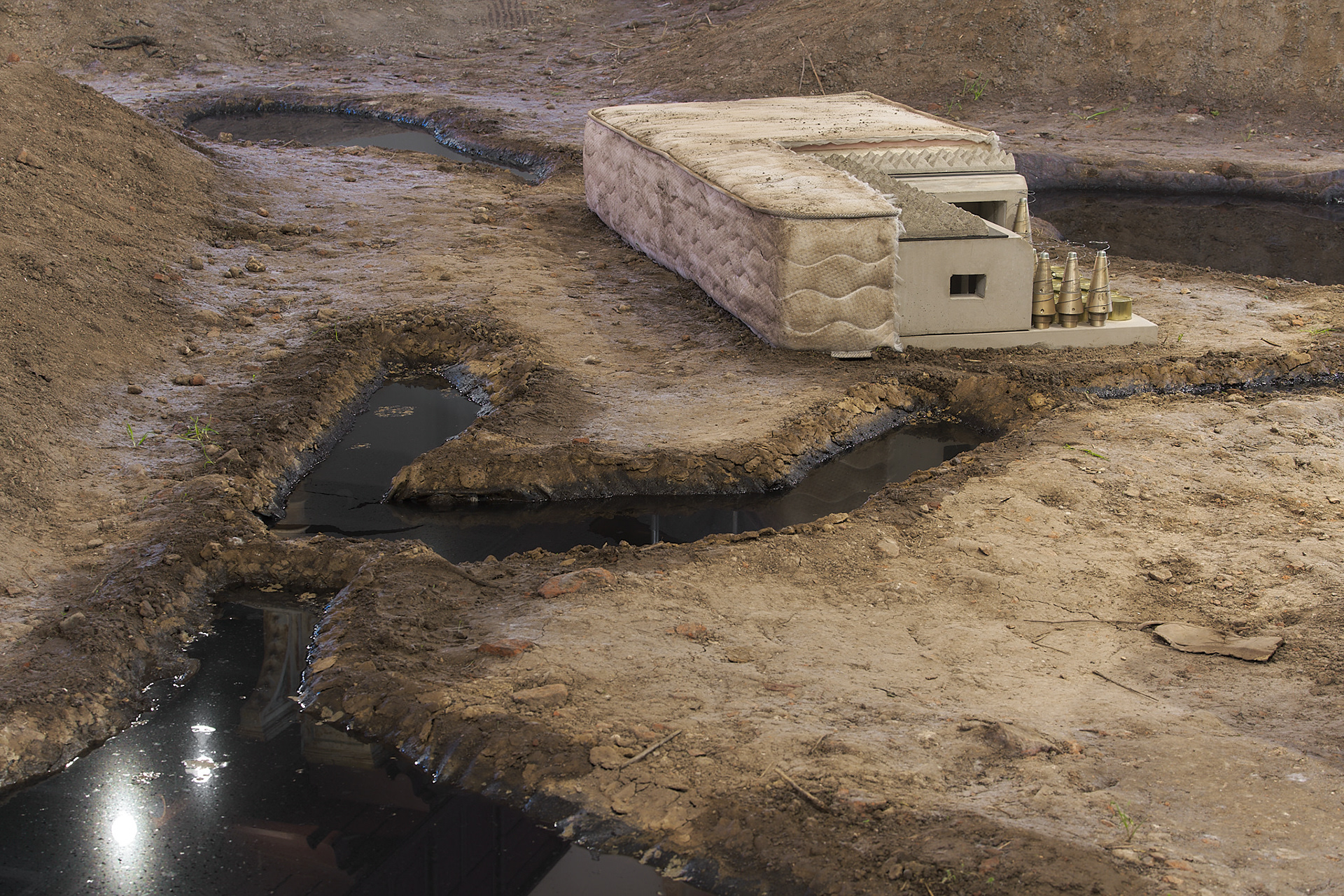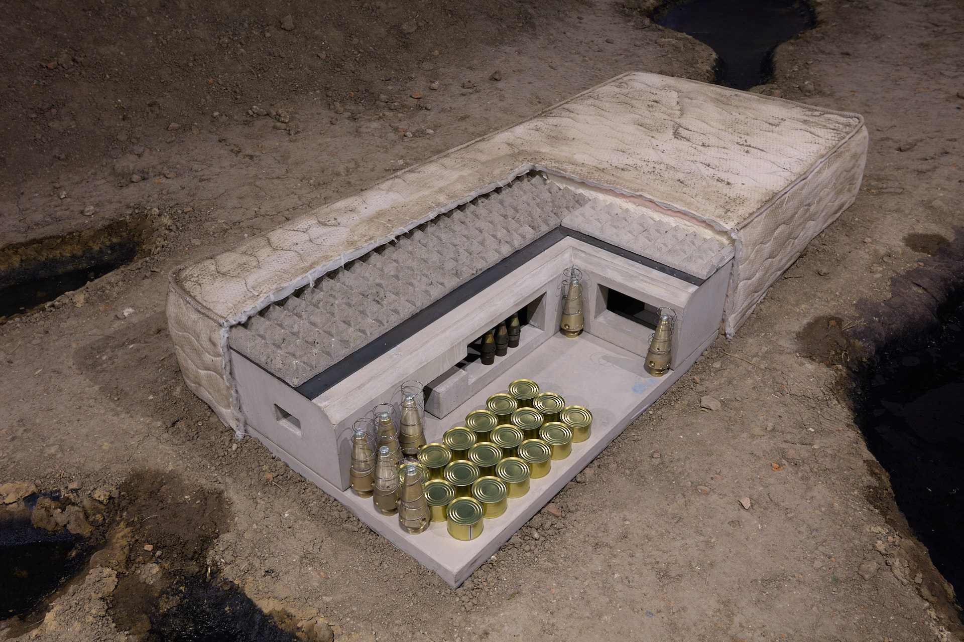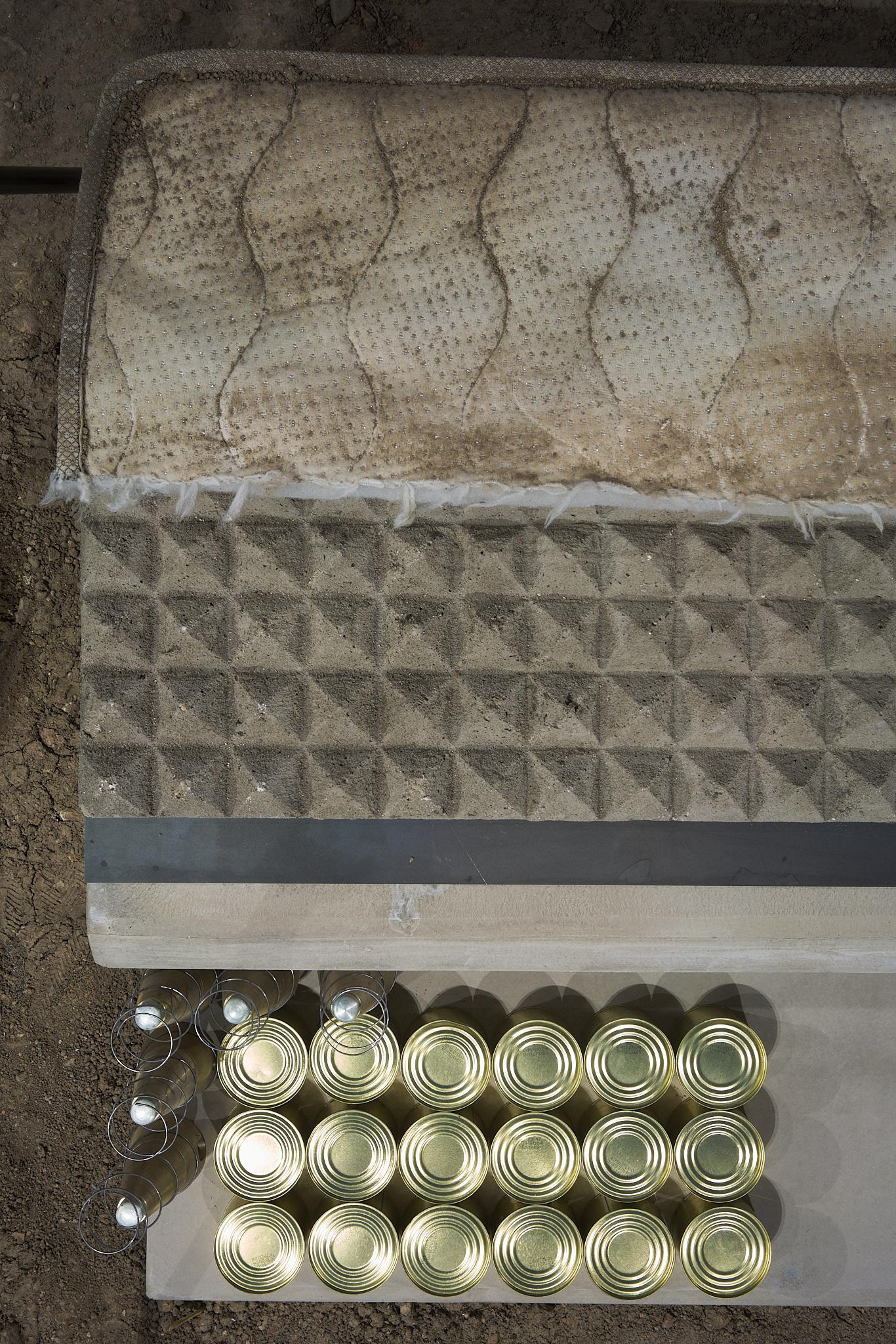 The mystery of the bed, 2025, mattress, concrete, metal, springs, cans, military ammunition, 200 x 90 x 38 cm (photo: Andrej Balco)