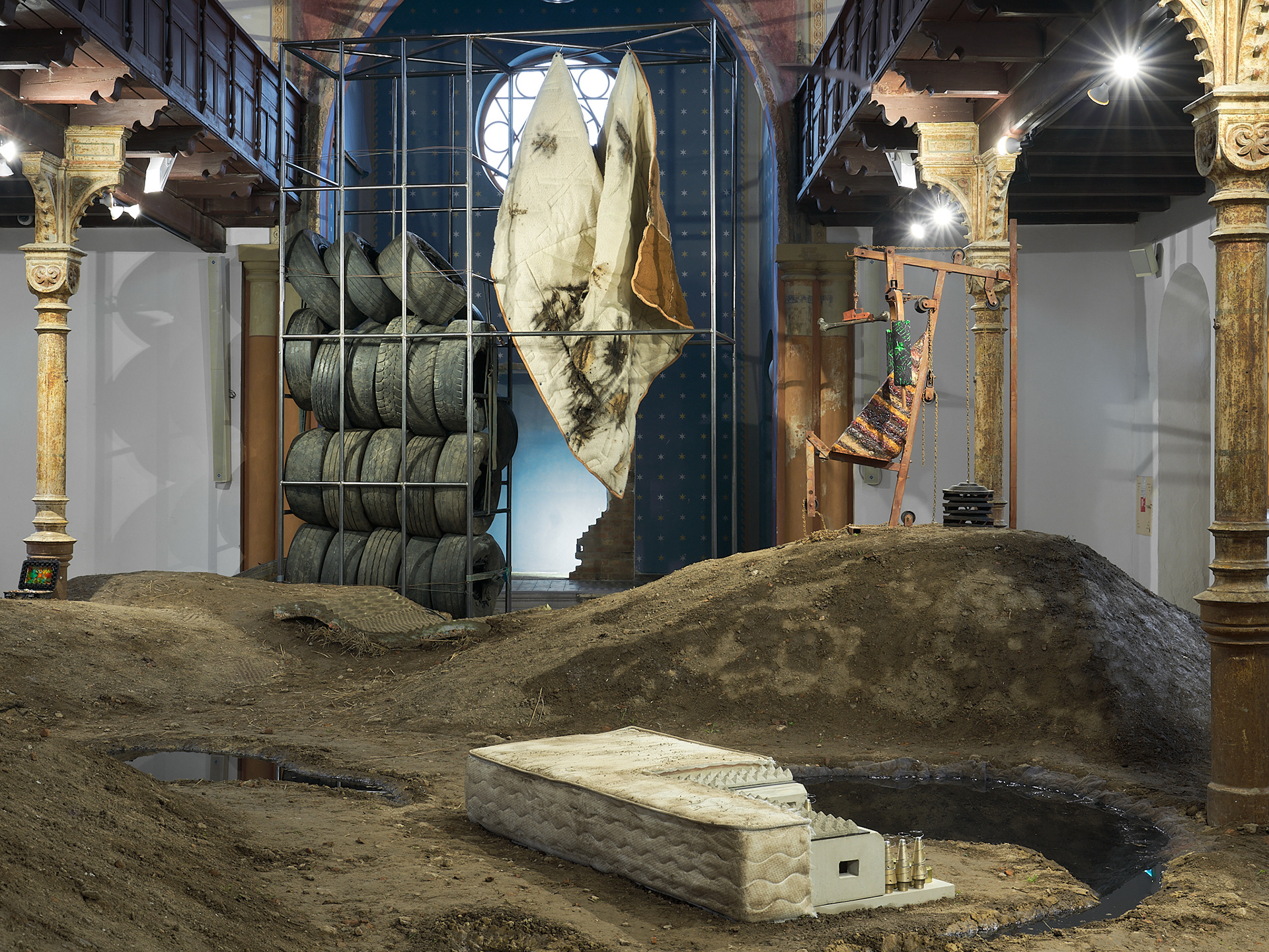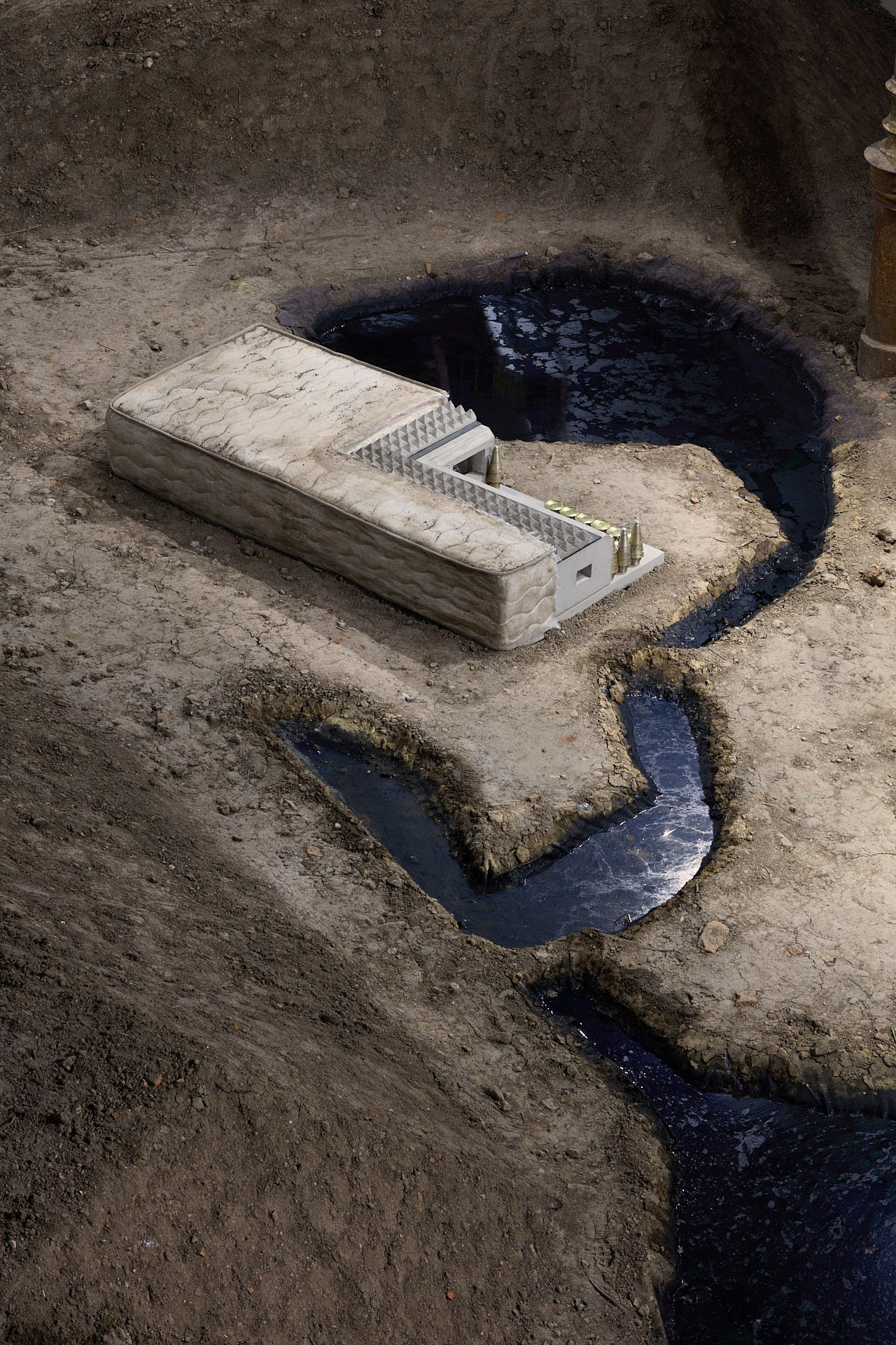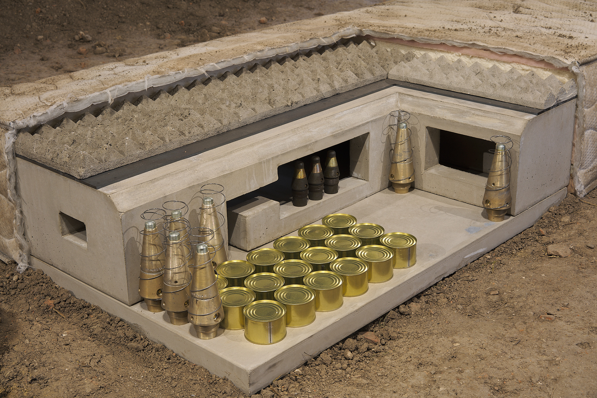 The mystery of the bed, 2025, mattress, concrete, metal, springs, cans, military ammunition, 200 x 90 x 38 cm (photo: Andrej Balco)